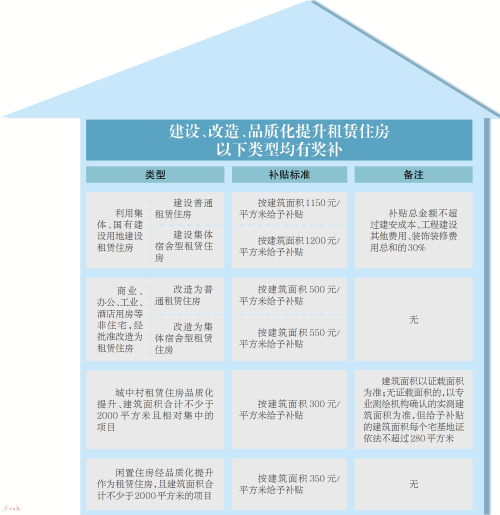 《辦法》提出,為環(huán)衛(wèi)工人、公共交通一線從業(yè)人員等城市重要公共服務(wù)群體提供租賃住房,且租金接受政府指導的,按以下標準給予補貼:新建租賃住房的,按建筑面積1200元/平方米給予補貼;改造租賃住房的,按建筑面積800元/平方米給予補貼;實施品質(zhì)化提升的租賃住房項目,按建筑面積600元/平方米給予補貼。