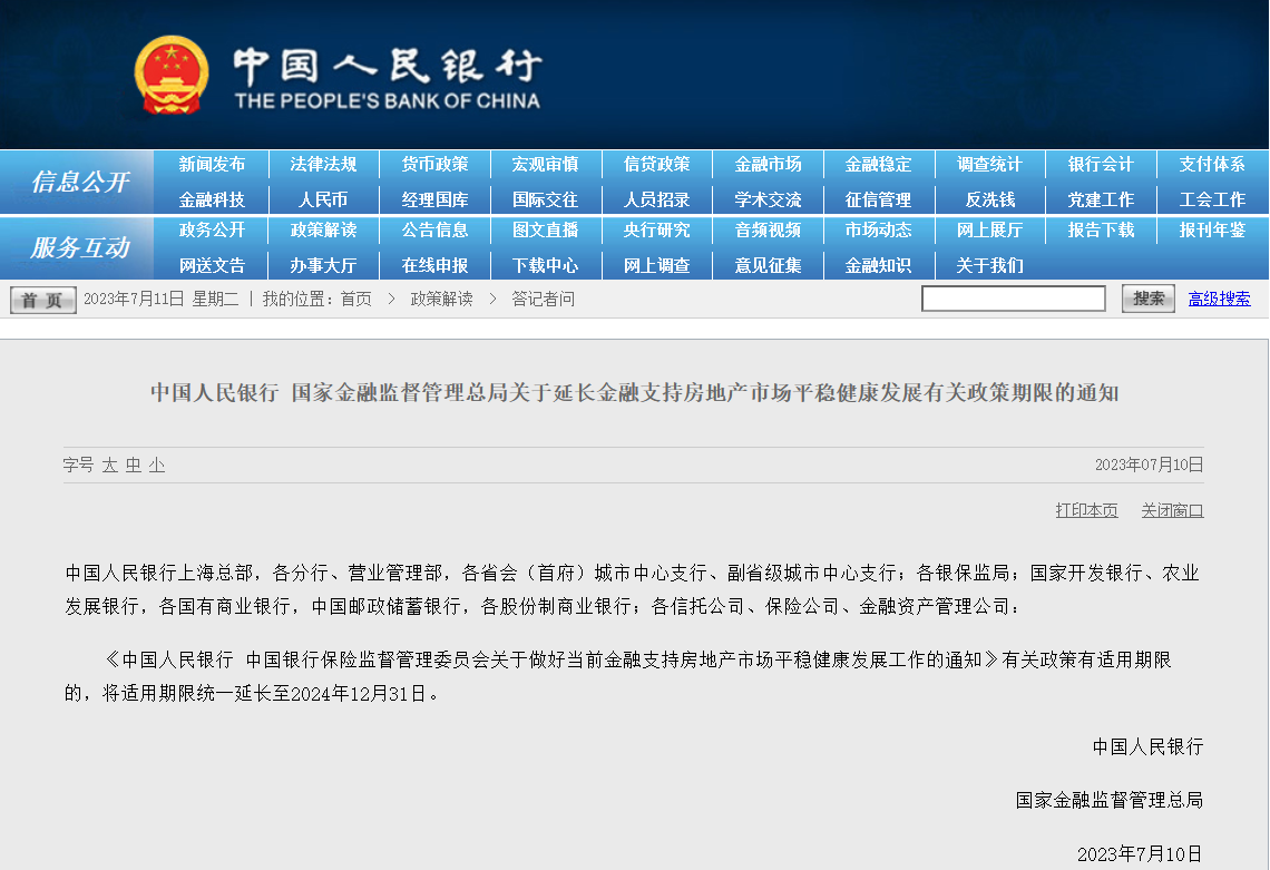 央廣網(wǎng)北京7月11日消息 據(jù)中國人民銀行網(wǎng)站消息,中國人民銀行、國家金融監(jiān)督管理總局7月10日發(fā)布通知,將去年發(fā)布的支持房地產(chǎn)“金融16條”部分政策,適用期限延長至2024年12月31日。