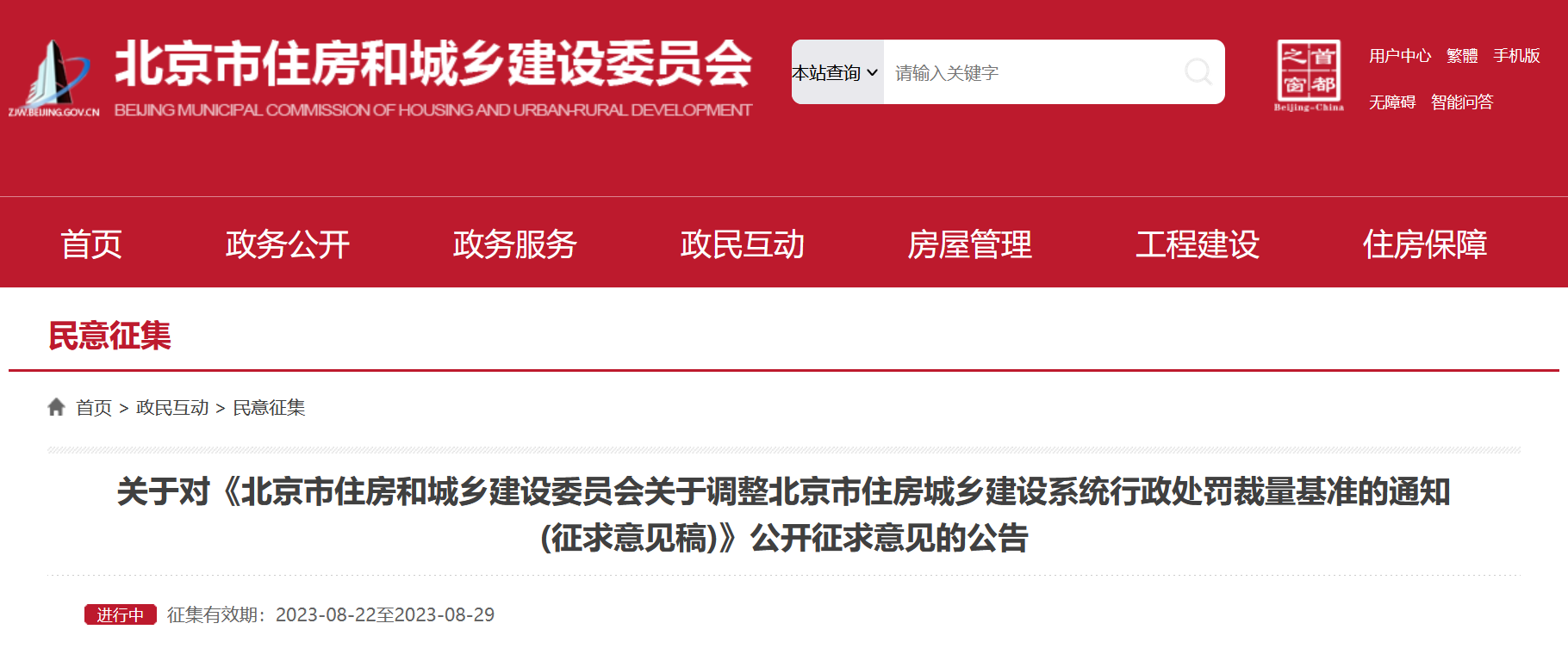 央廣網(wǎng)北京8月23日消息 據(jù)北京市住房和城鄉(xiāng)建設(shè)委員網(wǎng)站消息,為貫徹落實(shí)《建設(shè)工程質(zhì)量檢測(cè)管理辦法》《房地產(chǎn)開(kāi)發(fā)企業(yè)資質(zhì)管理規(guī)定》相關(guān)處罰職權(quán),北京市住房和城鄉(xiāng)建設(shè)委員會(huì)制定了《北京市住房和城鄉(xiāng)建設(shè)委員會(huì)關(guān)于調(diào)整北京市住房城鄉(xiāng)建設(shè)系統(tǒng)行政處罰裁量基準(zhǔn)的通知(征求意見(jiàn)稿)》,現(xiàn)向社會(huì)公開(kāi)征求意見(jiàn)。公開(kāi)征集意見(jiàn)時(shí)間為:2023年8月22日至8月29日。