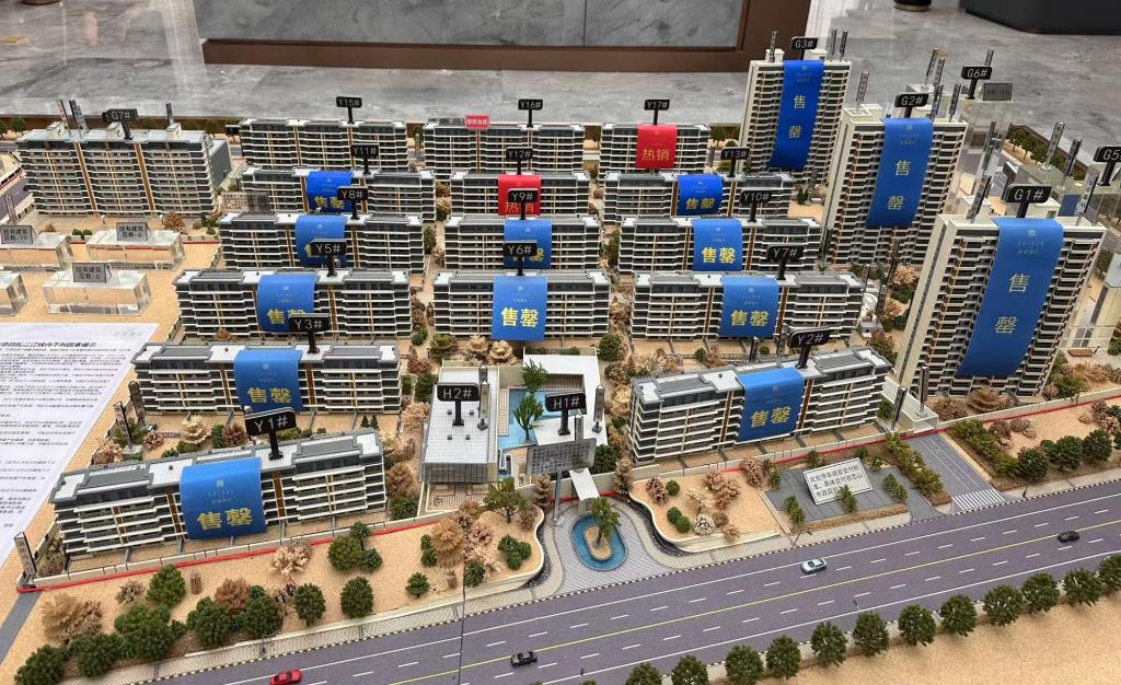 沈陽(yáng)一處樓盤,售樓處的沙盤顯示大多數(shù)樓宇已售罄。新華社記者鄒明仲 攝