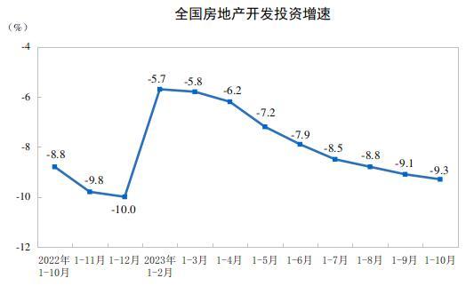 1—10月份,全國房地產開發(fā)投資95922億元,同比下降9.3%(按可比口徑計算,詳見附注6);其中,住宅投資72799億元,下降8.8%。