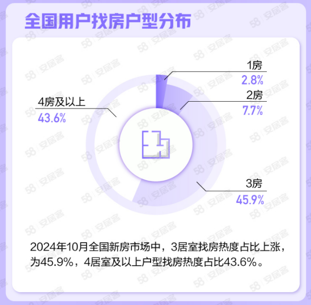 在用戶找房戶型方面,3居室仍為現(xiàn)階段熱度較高的戶型,找房熱度占比上漲,為45.9%,4居室及以上戶型找房熱度占比43.6%。張波分析稱,改善潛在需求入場的趨勢表現(xiàn)明顯,10月全國購房群體中三、四房的需求占比持續(xù)提升,二手房交易稅費的減免加之利率下行,是推動改善需求積極入市的組合性政策效果表現(xiàn)。