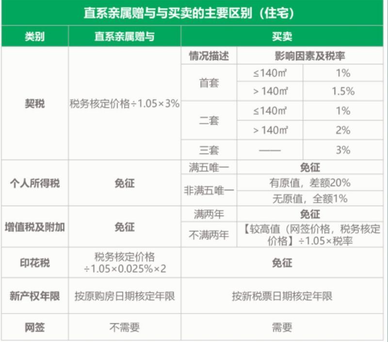 對此,北京鏈家簽約服務中心相關負責人表示,在直系親屬間進行房屋轉移(過戶)時,贈與和買賣是兩種常見的方式。雖然它們的目的相似,但在稅費方面卻存在顯著的區(qū)別。其中,贈與方式涉及契稅、印花稅,買賣方式則涉及契稅、個人所得稅、增值稅及附加、印花稅,具體可見下表。