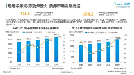 易觀報告顯示,隨著經(jīng)濟社會的發(fā)展和文娛消費的擴張,過去一年,現(xiàn)場娛樂規(guī)模穩(wěn)步增長,票務市場發(fā)展提速。據(jù)易觀統(tǒng)計,2018年中國現(xiàn)場娛樂市場整體規(guī)模預計達到521.1億元人民幣,同比增長約6.5%;其中票房規(guī)模預計達到189.2億元,較上一年增長約7.0%,占現(xiàn)場娛樂整體市場規(guī)模的36.3%。