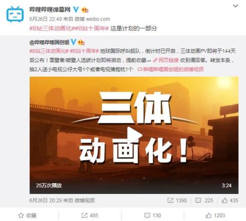 B站宣布《三體》動畫化。微博截圖