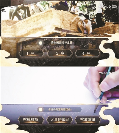 紀(jì)錄片相對小眾,知識性遠(yuǎn)遠(yuǎn)大于娛樂性,尤其是有些作品中知識呈現(xiàn)方式的無趣加深了與大眾的隔閡,最后知識的傳達(dá)率也難以考察。但在互動紀(jì)錄片中,知識的接受甚至變成一種強(qiáng)制性的沉浸行為,因?yàn)橛^眾自己必須做選擇題。比如《古墓派·互動季》中重回當(dāng)年的考古現(xiàn)場,你是“就地開棺”還是“運(yùn)回實(shí)驗(yàn)室”?甚至還有一些更專業(yè)的互動,在第三集《致命死因》中,觀眾需要判斷這兩具尸體的死因,究竟是死于吞金、投毒,還是別的原因呢?不同的選擇會觸發(fā)不同的劇情或者醫(yī)學(xué)解讀。
