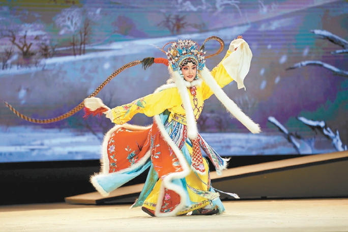 雖然以傳統(tǒng)戲為主,但是可以看出來這部戲力圖呈現(xiàn)四大美人與眾不同的一面。風雷京劇團團長松巖表示,他們希望不再是簡單地平面化呈現(xiàn)四大美人的外貌之美,而是要彰顯她們的精神之美,“從我個人情感來講,王昭君不只是一個簡單的美人,更是一個偉大的使者?!痹谖枧_呈現(xiàn)上,雖然有儀仗隊前來送行,但儀仗隊待在角落,王昭君則獨自站在風雪中,“她心里凄涼,但又懷著為祖國、為和平奉獻力量的熱情。”松巖說,他希望通過京劇表演和音樂、多媒體手段的結(jié)合,讓觀眾不僅能夠欣賞京劇的唱念做打,還能感受到傳統(tǒng)京劇舞臺上感受不到的真情實景的氛圍。