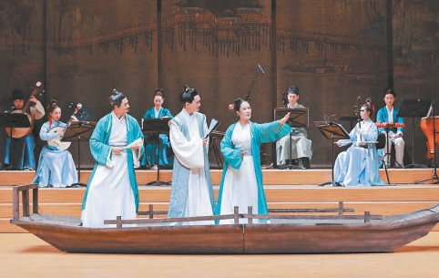 北京民族樂團(tuán)玖樂室內(nèi)樂組合擔(dān)任現(xiàn)場(chǎng)演奏,24首樂曲穿插在劇情中,訴盡人世間的離合悲歡。這些音樂作品既有傳統(tǒng)古曲,也有改編自影視音樂的當(dāng)代作品片段,與劇情故事的發(fā)展嚴(yán)絲合縫地呼應(yīng)。玖樂室內(nèi)樂組合的成員身穿宋制服裝,坐在舞臺(tái)后方,與舞臺(tái)正中央的一葉孤舟呼應(yīng),讓《人生的盛宴》的舞臺(tái)有如古畫。民樂室內(nèi)樂的現(xiàn)場(chǎng)演奏不僅僅是伴奏或添彩,更是劇目呈現(xiàn)不可或缺的一部分。