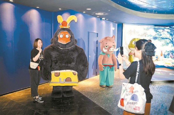 從走出軌交徐家匯站的那一刻起,“浪浪山”主題燈箱便接連映入眼簾,悄然揭開這個(gè)奇幻宇宙的序幕;美羅城商場(chǎng)球幕上的“小豬妖”頭像和“這條路走對(duì)了”的標(biāo)語,引人駐足眺望;走進(jìn)“大王洞”觀影,挑選三五周邊玩偶、精美文創(chuàng)產(chǎn)品,在360°環(huán)形劇場(chǎng)聽一場(chǎng)“浪浪山開放麥”,在“豬媽媽茶水站”來一杯飲料……這趟沉浸式體驗(yàn)豐富而圓滿。