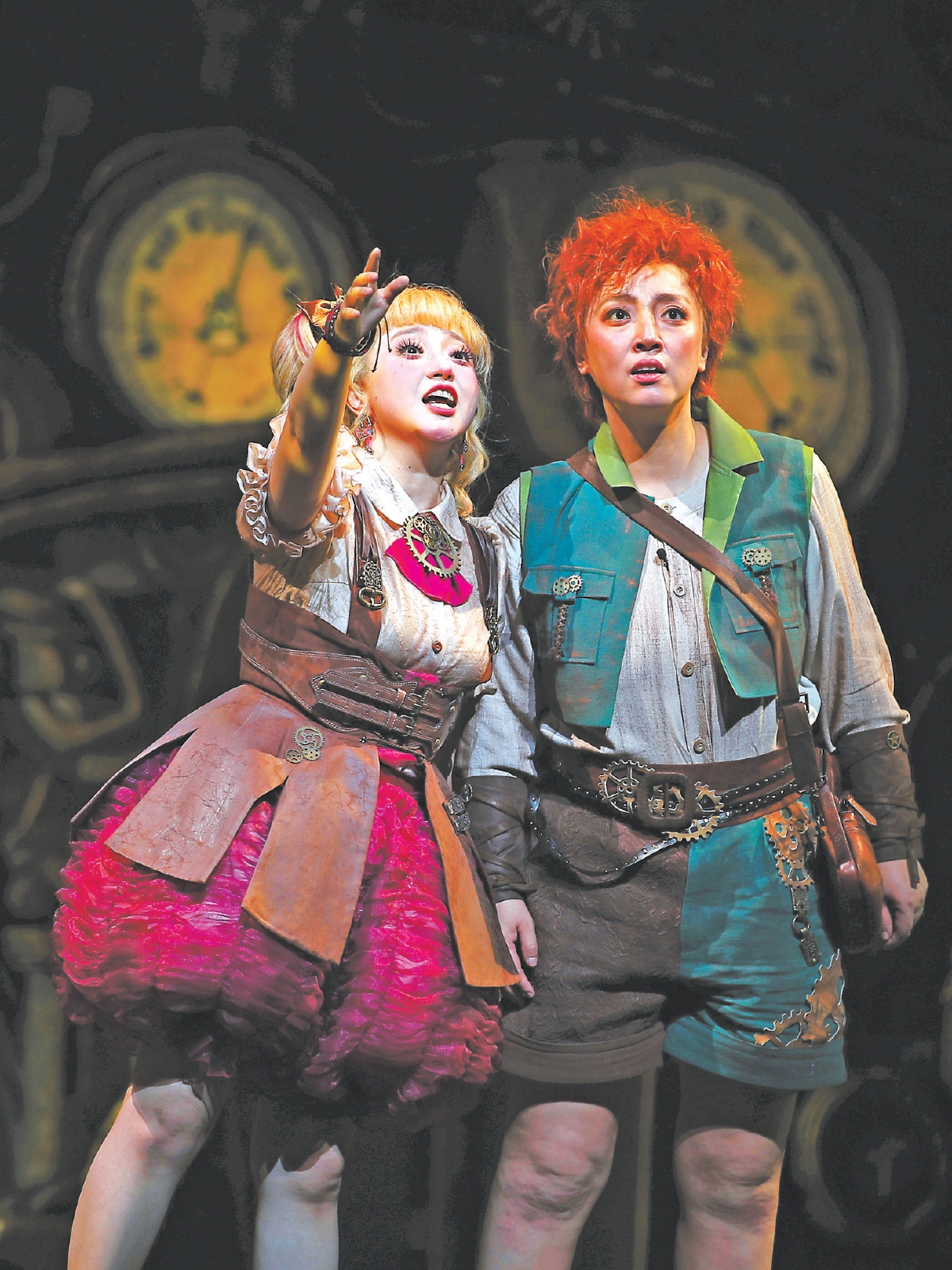 除了優(yōu)美的音樂和沉浸式的互動設(shè)計,該劇富有想象力的舞美還原了洪佩爾丁克筆下《漢塞爾與格蕾泰爾》溫馨、奇幻的絕妙特征?!霸谠O(shè)計時,我試圖構(gòu)建一個全新的場景,創(chuàng)造一個新奇的蒸汽朋克世界。”舞美設(shè)計常煒表示。在主要場景中,大量使用蒸汽朋克風(fēng)格的機(jī)械元素,如齒輪、管道和機(jī)器零件作為舞臺布景的一部分,與《糖果屋》夢幻元素相融合,造型上以扭曲變形的表現(xiàn)手法,營造出奇幻而機(jī)械化的場景。古銅復(fù)古的色調(diào)加上少量鮮艷的色彩,為舞臺增添一種古老而神秘的氛圍,與夢境這場戲的夢幻元素形成有趣的對比。