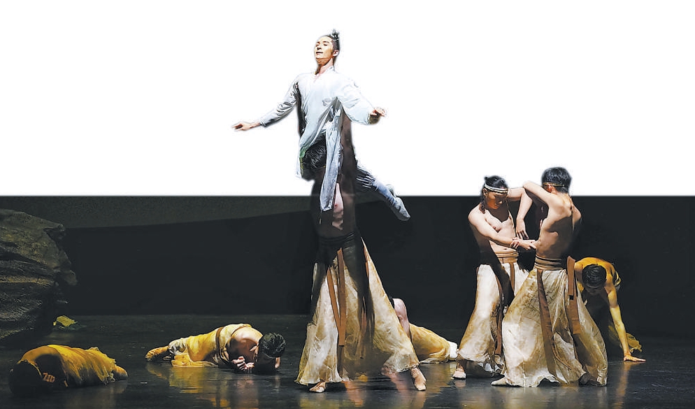 說到對(duì)這部作品的第一印象,很多觀眾會(huì)說它非?!百M(fèi)張翰”。中國東方演藝集團(tuán)舞蹈演員、曾出演《只此青綠》希孟一角的張翰,在《九歌》中飾演河伯,他與胡陽飾演的山鬼形成一組對(duì)照關(guān)系。劇中,河伯與山鬼有高難度的雙人舞,河伯也有自己和群舞配合的舞段,由于要表現(xiàn)出如水般流淌、隨物賦形的特點(diǎn),張翰的大量動(dòng)作被群舞演員托舉完成。托舉中,張翰還要用自己的身體表現(xiàn)奔騰的、柔弱的、逍遙的、浪漫的等多種狀態(tài),對(duì)體力消耗極大。排練中,張翰經(jīng)常在跳完這段舞蹈后汗如雨下。