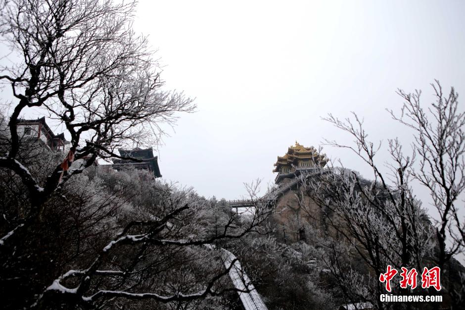 3月23日,河南洛陽老君山遭遇“倒春寒”,海拔2000米的老君山三月飛起“桃花雪”,玉樹瓊枝、銀裝素裹,金頂廟宇和蒼松翠柏相襯,猶如一幅精致的水墨畫。 中新社記者 王中舉 攝