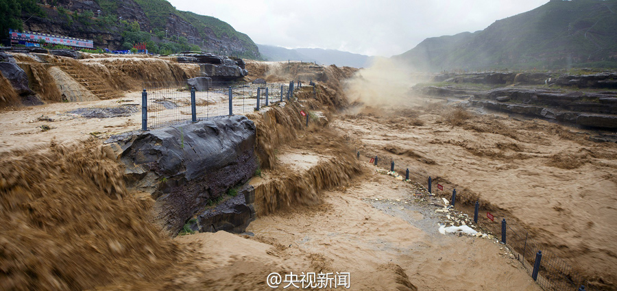 受上游強(qiáng)降雨和水庫(kù)放水影響,最近幾天,黃河壺口瀑布迎來(lái)伏汛,最大水流量達(dá)到每秒2600立方米左右,濁流滾滾奔騰而下,氣勢(shì)磅礴!(央視記者李志 文豪)