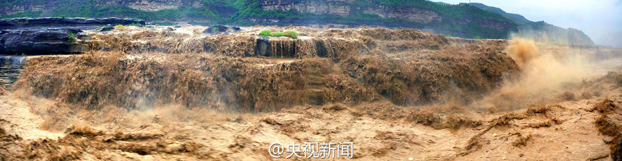 受上游強(qiáng)降雨和水庫(kù)放水影響,最近幾天,黃河壺口瀑布迎來(lái)伏汛,最大水流量達(dá)到每秒2600立方米左右,濁流滾滾奔騰而下,氣勢(shì)磅礴!(央視記者李志 文豪)