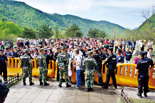 5月18日深夜,隨著三個入山口人流的驟增,原定22時30分上崗的民警提前到20時全部到位。23時40分,記者來到南線游客中心,只見潮水般的人群涌向售票大廳,不少公安民警在安監(jiān)門口嚴(yán)密把守,有序放行,站在臺階上的民警手舉超大口徑的大喇叭向嘈雜擁擠的人海不斷地呼喊:“不要擁擠,有序排隊!”在游客中心東邊的交通要道上,全副武裝的交通民警正在緊張地疏導(dǎo)川流不息的車輛。19日1時燈光下,記者看到擔(dān)任此次安??傊笓]的市公安局局長楊梅喜在寒風(fēng)中與民警一道指揮交通。