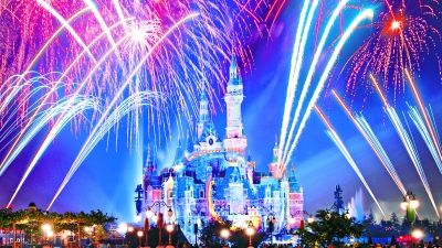 迪士尼奇幻童話城堡的焰火表演。