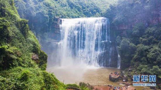 6月15日,游客在赤水大瀑布景區(qū)觀光游玩(無人機(jī)照片)。 新華社記者 陶亮 攝