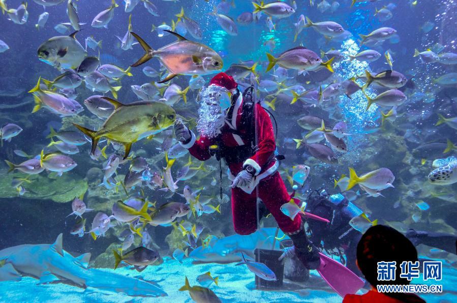 這家水族館近日推出“圣誕老人”潛水表演,迎接圣誕節(jié)的到來。