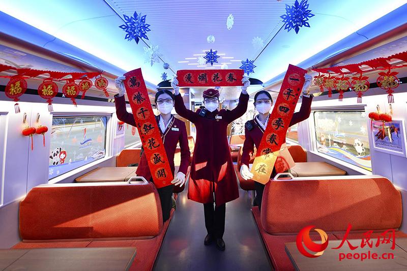 2021年春運是疫情防控常態(tài)化下的首個春運,全國上下提倡就地過年,鐵路部門科學(xué)調(diào)整運力,努力實現(xiàn)“平安春運、有序春運、溫馨春運,讓旅客體驗更美好”的春運目標。2021年2月4日,正值北方小年,同時也是北京2022年冬殘奧會開幕倒計時一周年,北京局集團公司北京客運段京張高鐵車隊擔當?shù)腉8881次列車始發(fā)前,列車工作人員用窗花等裝飾品布置車廂,打造溫馨的出行環(huán)境,營造濃濃的“年味”。(圖片來源:北京鐵路局集團公司北京客運段 毛衛(wèi)華 攝)