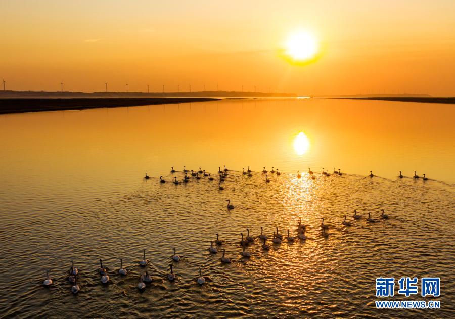 2月20日,在鄱陽湖都昌水域,小天鵝在夕陽下游弋(無人機(jī)照片)。