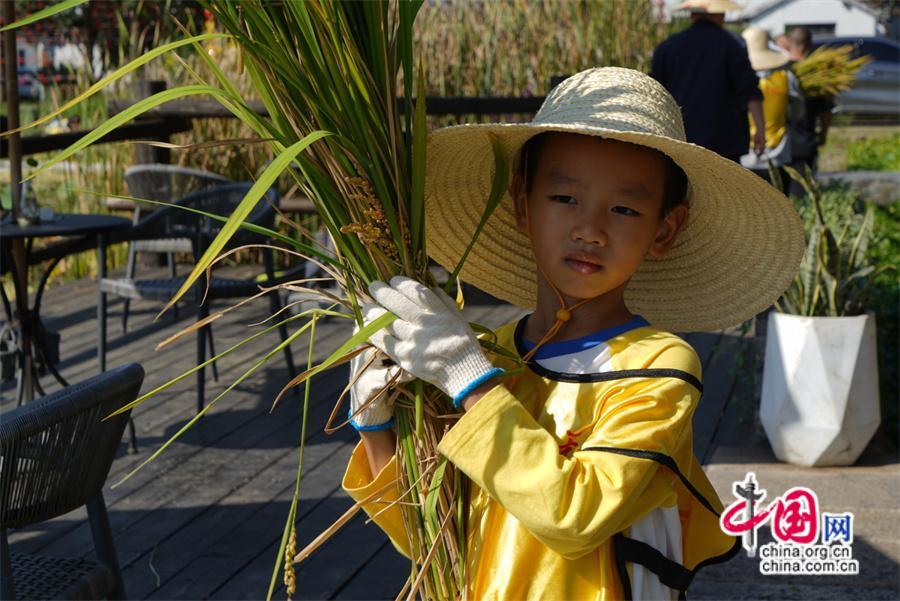 香村的管家將草帽與鐮刀發(fā)放給孩子們,再由經(jīng)驗頗豐的伯伯示范,再到實操,一場歡樂的割稻子活動在田間展開。參與勞作,真切體會那句“粒粒皆辛苦”,在割稻子現(xiàn)場,也能感受到大人們也躍躍欲試,“這邊,這樣割,不對,不對,哎呀……我來”略顯著急的“指揮”著孩子,或許,這樣的場景也帶給家長們重回童年無憂時光的快樂。