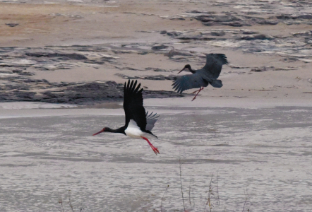 兩只黑鸛在吉縣黃河壺口瀑布上游水面飛翔。黑鸛是世界瀕危鳥類,數(shù)量稀少,被喻為“鳥中大熊貓”。
