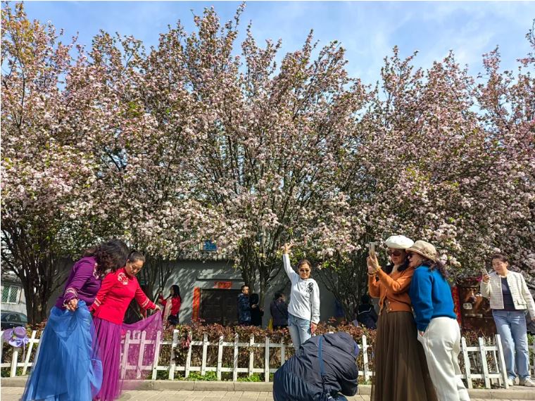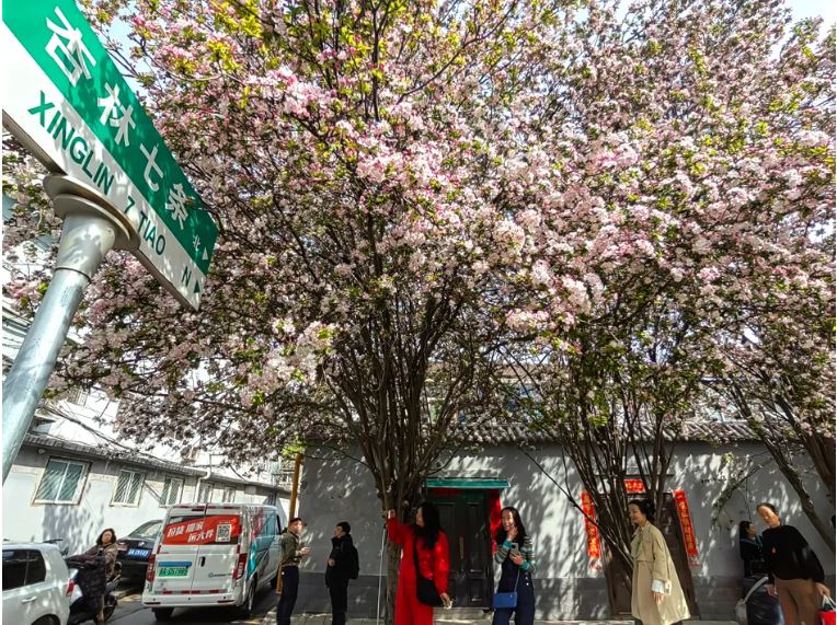 “一朵海棠露春芳,一樹海棠春滿堂?!薄斑@個(gè)路牌也太春天了吧,趁著春光明媚,帶上相機(jī)來打卡吧?!薄斑@幾天,這里成了最浪漫的打卡地,喜歡拍照的,趕快去吧!”杏林七條海棠花綻放,從去年海棠盛開時(shí)就火爆出圈,幾十米長(zhǎng)的小巷總能看到游人如織的場(chǎng)景,這處隱匿在鬧市中的花海如此熱鬧,許多市民都是看到短視頻后慕名而來,希望與這片美麗花海來一次親密接觸。