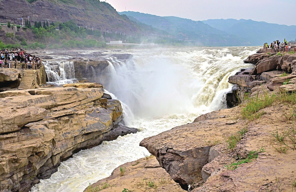 7月2日,游客在吉縣黃河壺口瀑布景區(qū)游覽觀瀑。近日,黃河進(jìn)入主汛期,受上游降雨增多和水庫調(diào)節(jié)放水影響,黃河壺口瀑布水量大增,吸引了眾多游客。