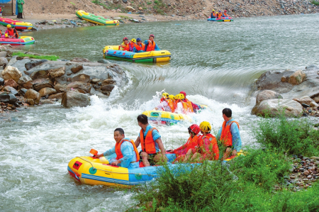 體驗完水上樂園后,張子良一行乘車來到位于中莊村的龐泉溝激情漂流。剛下車就看到了碼頭上熱鬧的景象,一艘艘漂流艇上坐滿了前來體驗的游客,大家穿著救生衣在工作人員的護送下向下漂流。偶爾遇到一處急流險灘,漂流艇隨著奔騰的水流飛馳而起,一眨眼的工夫就已落到了下一個平潭區(qū),游客們發(fā)出了陣陣尖叫。一路刺激,一路驚心,漂流給游客們留下了深刻的印象。負責該項目的閔玉貴介紹,項目選取了文峪河最精華的10公里河道,累計落差130米,平均水深0.8米,河道時寬時窄,水流時急時緩,沿途既有急流險灘,又有緩流碧潭,由于經(jīng)過了精心設計,且河道兩岸安排了上百名安全員護航,可以確保有驚無險。