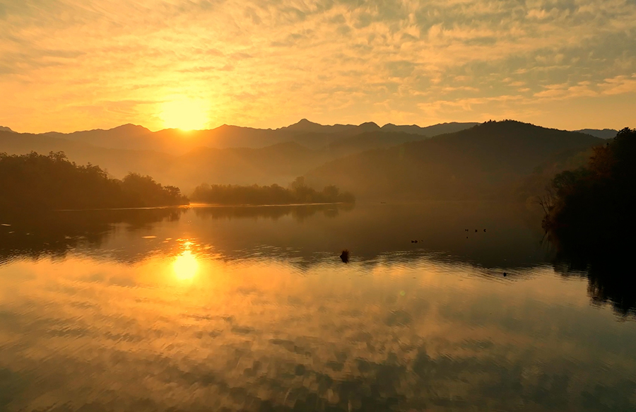 10月29日,在安徽省池州市的秋浦河畔,朝霞與水面相映成趣,泛舟秋浦河仿佛置身仙境。秋浦河是長江支流,風(fēng)光秀美,因唐代詩人李白的《秋浦歌十七首》等詩作而聞名。新華網(wǎng)發(fā)(王帆 攝)
