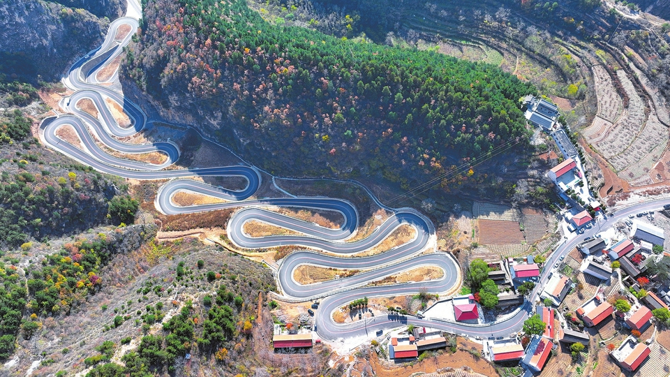 10月29日拍攝的太行一號(hào)旅游公路壺關(guān)縣東柏坡段,宛如巨龍盤踞在五彩斑斕的群山間。該路段連通了太行山大峽谷5A級(jí)風(fēng)景區(qū)等眾多景區(qū)、景點(diǎn)和古村落,也因奇險(xiǎn)峻美成為網(wǎng)紅打卡地,成為當(dāng)?shù)匚穆每叼B(yǎng)產(chǎn)業(yè)的快速路、致富路。