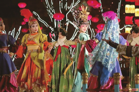 有才華的游客可以在《盛唐密盒》處舉手示意,與演員互動;喜歡李白的游客可以在《詩歌藝術(shù)》處與李白 對詩;《花車 斗彩》處西域胡姬與大唐美女現(xiàn)場斗舞,彰顯盛唐時期絲路文化和盛唐文化的和諧交融,仿佛到了古裝電視劇中的上元節(jié);《貞觀之治》處則可感受李世民時期萬國來朝賀的盛世景象;一路有行為藝術(shù),《武士雕刻》《奮斗在路上》《畫中人》《戲演壁畫》等讓人目不暇接,一路走走停停,到達最南端的開元廣場,就可以看一場大唐不夜城場地最大、演員最多、時間最長的表演《再回長安》,感受大詩人白居易回長安的盛大氛圍;開元廣場東側(cè)不倒翁小姐姐表演,周圍也圍著很多游客,不遠萬里前來一睹小姐姐美麗的身姿。