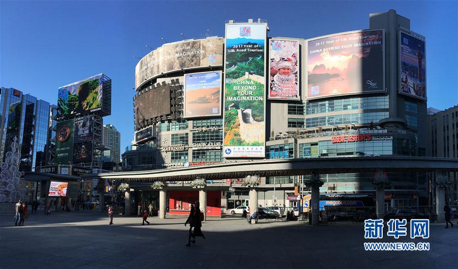 這是1月1日在加拿大多倫多市中心的鄧達(dá)斯廣場拍攝的“美麗中國——2017絲綢之路旅游年”主題宣傳廣告牌。從2016年12月26日起,由中國國家旅游局推出、以“美麗中國——2017絲綢之路旅游年”為主題的大型旅游宣傳廣告在加拿大多倫多市中心鄧達(dá)斯廣場亮相,向人們展示中國美麗而豐富的旅游資源。整個(gè)活動(dòng)將持續(xù)5周。新華社發(fā)(鄒崢攝)
