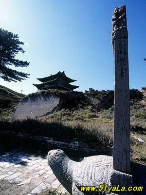 雄關(guān)雁門,居“天下九塞”之首(《呂氏春秋》)。從戰(zhàn)國時期的趙武靈王起,歷代都把此地看作戰(zhàn)略要地。趙置雁門郡,此后多以雁門為郡、道、縣建制戍守。雁門關(guān)之稱,始自唐初。因北方突厥崛起,屢有內(nèi)犯,唐駐軍于雁門山,于制高點鐵裹門設關(guān)城,戍卒防守?!短茣?middot;地理志》描述這里“東西山巖峭拔,中有路,盤旋崎嶇,絕頂置關(guān),謂立西徑關(guān),亦曰雁門關(guān)。”后經(jīng)五代十國、宋、遼、金、元約四百余載。元朝設千戶所,關(guān)城被毀。明代吉安侯陸享于洪武七年(1374)自監(jiān)民工筑新關(guān)于舊關(guān)東北十里處的要道。南距代城縣四十余里,北鄰廣武古城二十一里,地勢更為險要。明末清初的著名學者顧炎武曾親臨此地。他寫道“雁門重關(guān),山巒在演,霞飛云舉,兩山對峙,其形如門,而飛雁出于其間。”該關(guān)城,周長二里,墻高二丈,石座磚身,雉堞為齒,洞口三重,曰東門、西門、小北門。東門上筑樓臺,曰雁樓,門額嵌石匾一方,橫書“天險”(即“天險”)。西門上筑有楊六郎廟,門額嵌石匾一方,橫書“地利”(即“地利”)。小北門未設頂樓,但磚石結(jié)構(gòu),格外雄固。門額石匾橫刻:“雁門關(guān)”三字。洞門兩側(cè)鑲嵌磚鐫楷書檢聯(lián):“三關(guān)沖要無雙地,丸塞尊崇第一關(guān)。”東門外北側(cè)建有“靖邊寺”祀戰(zhàn)國時代的軍事家趙將李牧。西門外右側(cè)建有關(guān)帝廟。關(guān)城正北置有駐軍營房,東南設有練兵教場。整個關(guān)城建筑,虎踞龍盤,雄偉壯觀。明清以后,關(guān)城雖屢有重建。但隨著我多民族統(tǒng)一國家疆域的逐步形成,內(nèi)長城作為“內(nèi)邊”的作用已經(jīng)失去,所屬的雁門雄關(guān)也隨之荒廢?,F(xiàn)在的關(guān)城僅在東門、西門、小北門三個門洞和靖邊寺前的一對石獅,一副石旗桿,明鐫李牧碑石一塊,以及寺后的數(shù)株青松。