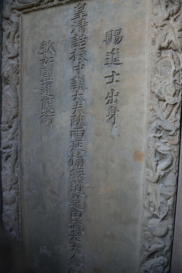 配坊實(shí)際上是一座功名石牌坊,上面刊載著武訪疇一家四代人的姓名及朝廷贈(zèng)封的官爵,咸豐六年(1856)由武訪疇修建。這座石雕牌坊與其它牌坊最大的區(qū)別就是沒(méi)有題刻坊名,因此只能稱之為配坊。坐北向南,為四柱三間三樓單檐歇山頂結(jié)構(gòu),牌樓高8米,寬12米,坊體坐落在近1米高的長(zhǎng)方形臺(tái)基上,立柱仍然采用夾柱石固定。坊頂覆蓋青瓦,正脊飾石雕貔貅裝飾,飛檐翹角,明樓檐下為“圣旨”牌,當(dāng)心間設(shè)兩層小字板,第一層題刻:“贈(zèng)資政大夫曾祖父廷桂,贈(zèng)夫人曾祖母李氏;誥贈(zèng)資政大夫祖父秉壁,誥贈(zèng)夫人祖母吳氏;誥贈(zèng)資政大夫父烈,誥封夫人母朱氏。陜西分巡延榆綏兵備道、加四級(jí)武訪疇謹(jǐn)建?!钡诙宇}刻“大清咸豐六年歲次丙辰仲夏上院榖旦”。武訪疇借建坊要弘揚(yáng)祖輩陰德,而祖輩的姓氏大名又不能題刻在母親的節(jié)孝牌坊上,所以,他必須另建一坊才能完整地表達(dá)心愿。實(shí)際上,這就是建造配坊的真正目的。也正因此在配坊題刻“龍光錫寵”、“鳳詔褒榮”、“克成先志”、“重裕后昆”等。