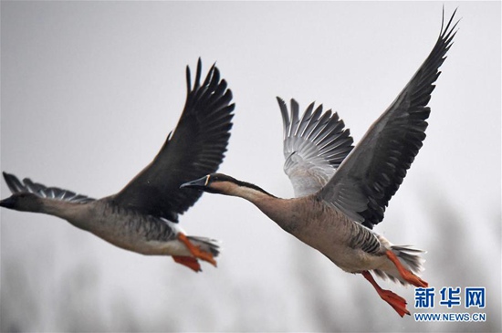 11月29日,候鳥在江西鄱陽湖南磯濕地國家級自然保護區(qū)飛翔。近日,大批南遷候鳥飛抵鄱陽湖棲息越冬。