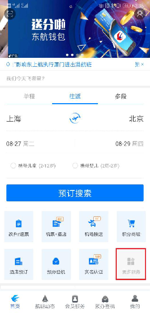 1.打開東方航空最新版APP,在【首頁】選擇【更多服務(wù)】