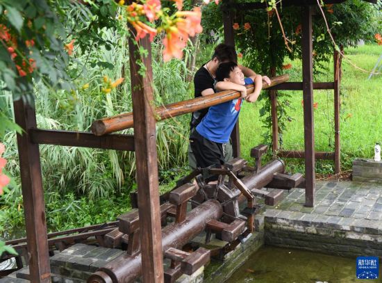 7月11日,游人在穆溝古村體驗(yàn)踩水車。