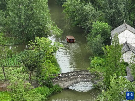 7月11日,游人乘船游覽穆溝古村(無(wú)人機(jī)照片)。