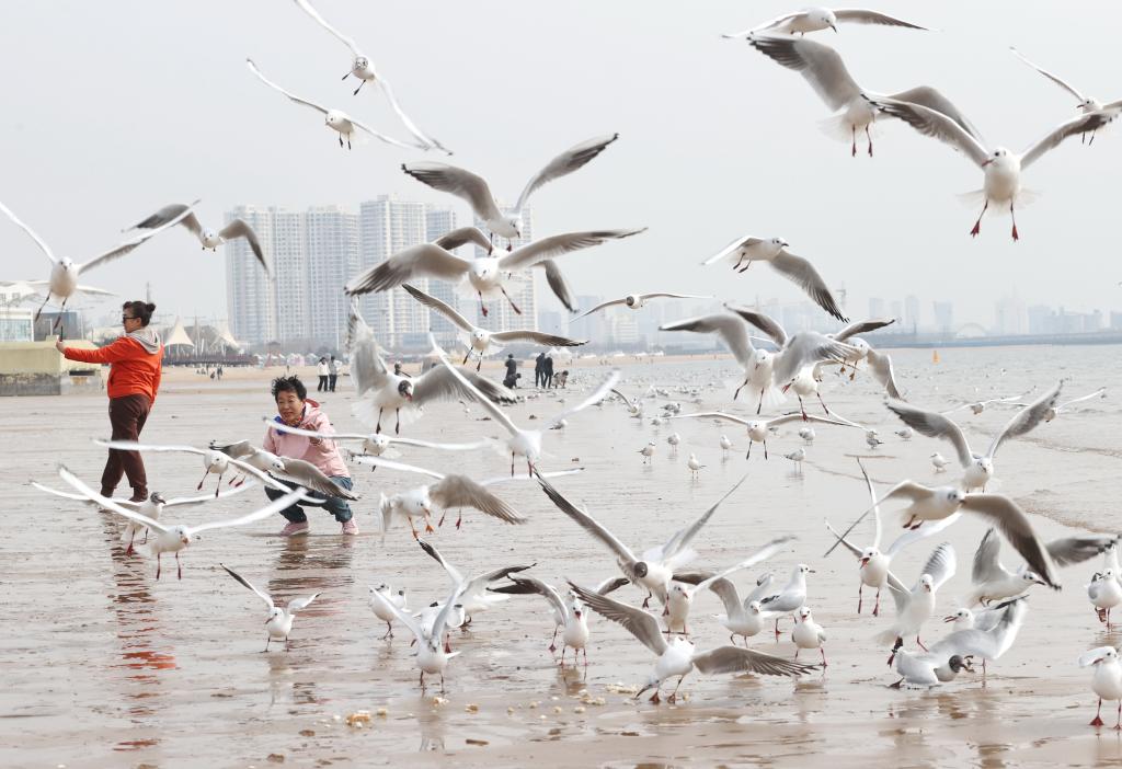 春日和暖,大批海鷗在河北省秦皇島市金夢(mèng)海灣浴場(chǎng)飛舞、覓食,吸引游客前來(lái)觀賞。