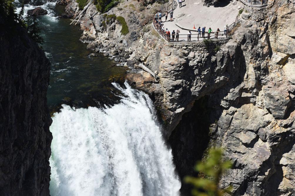 2019年9月3日,游客在美國(guó)黃石國(guó)家公園觀賞下瀑布。新華社記者韓芳攝