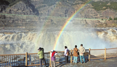 12月3日,游客在吉縣黃河壺口瀑布欣賞“雙彩虹”景觀。初冬時節(jié),受上游水庫調節(jié)放水影響,黃河壺口瀑布水量增大,飛濺的水霧經陽光照射,形成季節(jié)特有的“雙彩虹”景觀,吸引了眾多游客駐足觀賞。