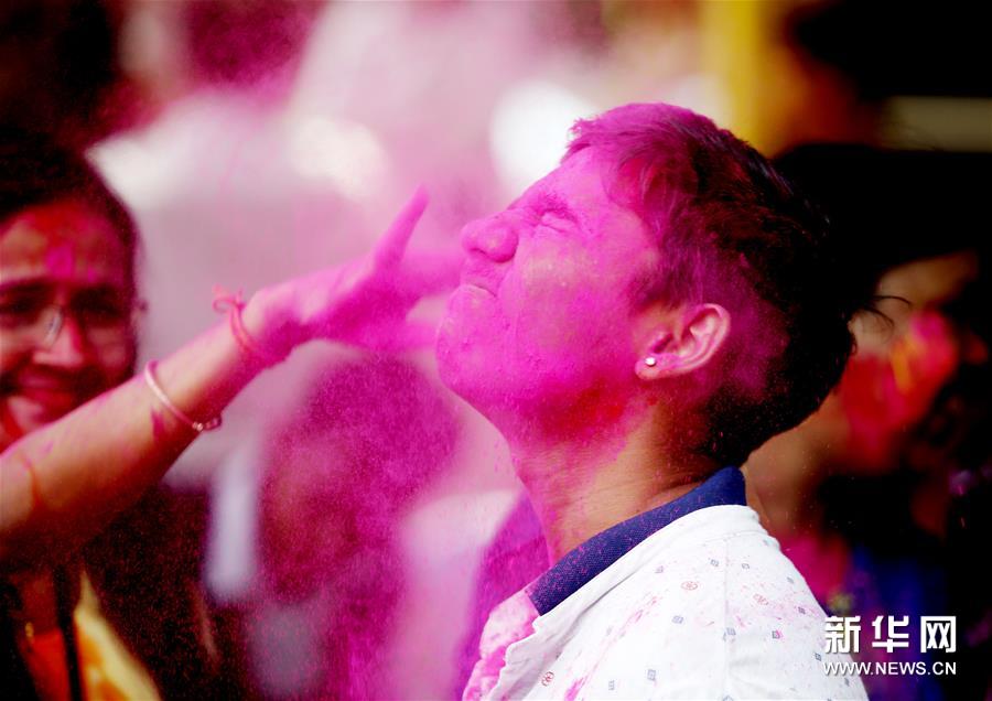 胡里節(jié)也叫“灑紅節(jié)”,人們?cè)谧约耗樕虾蜕砩贤可项伭?,還向別人拋撒五顏六色的顏料和粉末,迎接春天的到來(lái)。新華社發(fā)(吳昂 攝)