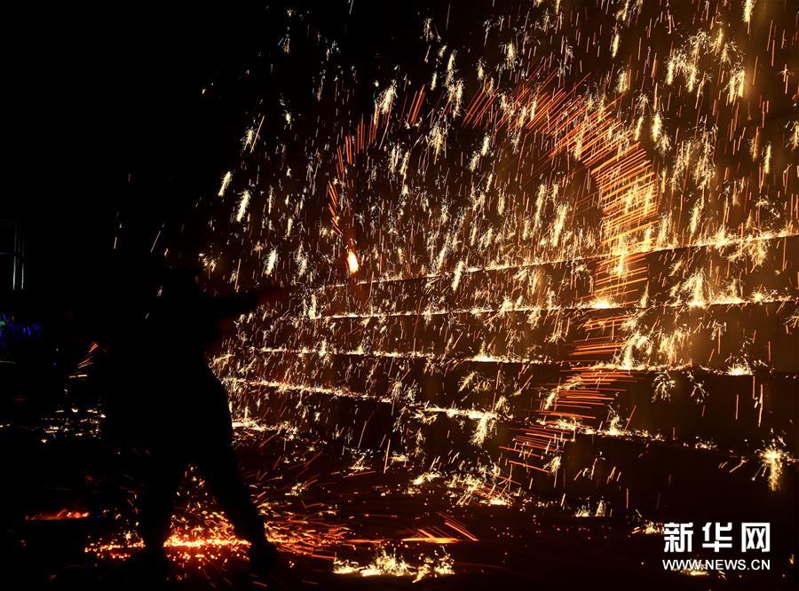 1月12日,河北磁縣開始舉行“打鐵花”慶新年活動?!按蜩F花”是以小煉鐵爐將生鐵化成鐵水后,用木板將鐵水加鋸末打上天空,鋸末在空中燃燒形成“鐵花火雨”四濺飛揚的景象。打鐵花”是當?shù)貧v史悠久的民俗娛樂活動。新華社發(fā) (趙鴻宇 攝)