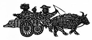 《姥爺送外甥》是靜樂民間老剪紙藝術(shù)家辛芙英早年的一幅剪紙,也是靜樂剪紙最具代表性的一幅名作,現(xiàn)收藏于中國(guó)美術(shù)館。這幅剪紙表現(xiàn)了閨女住完娘家之后,由父親(外甥的姥爺)趕著牛車送閨女和外甥回家的場(chǎng)面。剪紙人物造型生動(dòng)形象,樂趣橫生,令人百看不厭。