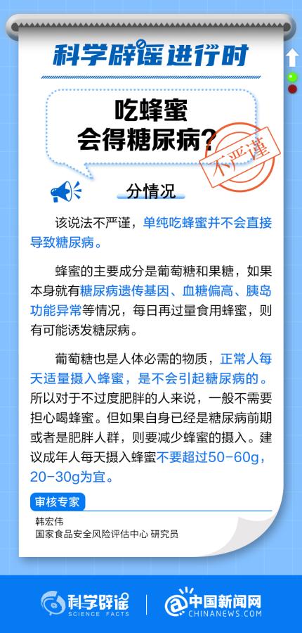中新網(wǎng)8月11日電 單純吃蜂蜜并不會直接導致糖尿病。蜂蜜的主要成分是葡萄糖和果糖,如果本身就有糖尿病遺傳基因、血糖偏高、胰島功能異常等情況,每日再過量食用蜂蜜,則有可能誘發(fā)糖尿病。(來源:@科學辟謠 中國新聞網(wǎng)微博 )