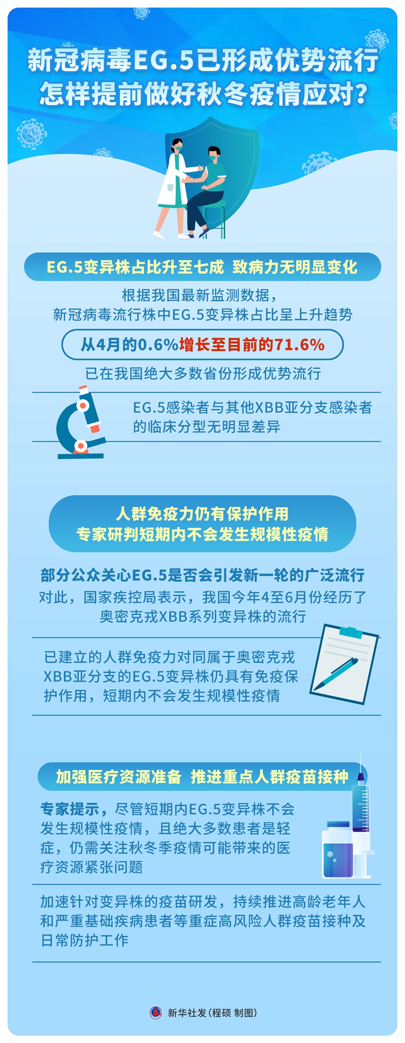 專家提示,盡管短期內(nèi)EG.5變異株不會發(fā)生規(guī)模性疫情,且絕大多數(shù)患者是輕癥,仍需關(guān)注秋冬季疫情可能帶來的醫(yī)療資源緊張問題,加速針對變異株的疫苗研發(fā),持續(xù)推進(jìn)高齡老年人和嚴(yán)重基礎(chǔ)疾病患者等重癥高風(fēng)險(xiǎn)人群疫苗接種及日常防護(hù)工作。