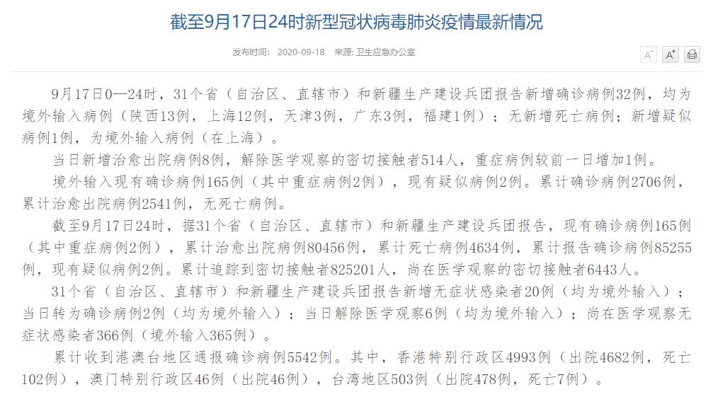 國家衛(wèi)健委:9月17日新增確診病例32例 均為境外輸入病例