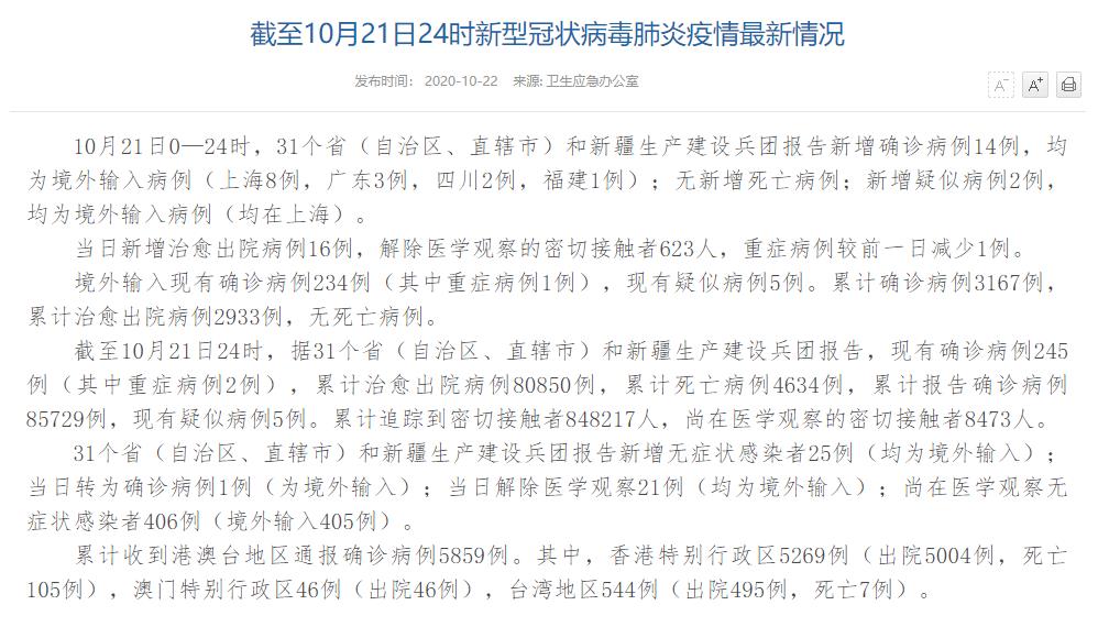 人民網(wǎng)北京10月22日電(董童)國家衛(wèi)生健康委于今日在官網(wǎng)發(fā)布的《截至10月21日24時新型冠狀病毒肺炎疫情最新情況》(以下簡稱“情況”)提出,10月21日0—24時,31個?。ㄗ灾螀^(qū)、直轄市)和新疆生產(chǎn)建設兵團報告新增確診病例14例,均為境外輸入病例(上海8例,廣東3例,四川2例,福建1例);無新增死亡病例;新增疑似病例2例,均為境外輸入病例(均在上海)。當日新增治愈出院病例16例,解除醫(yī)學觀察的密切接觸者623人,重癥病例較前一日減少1例。