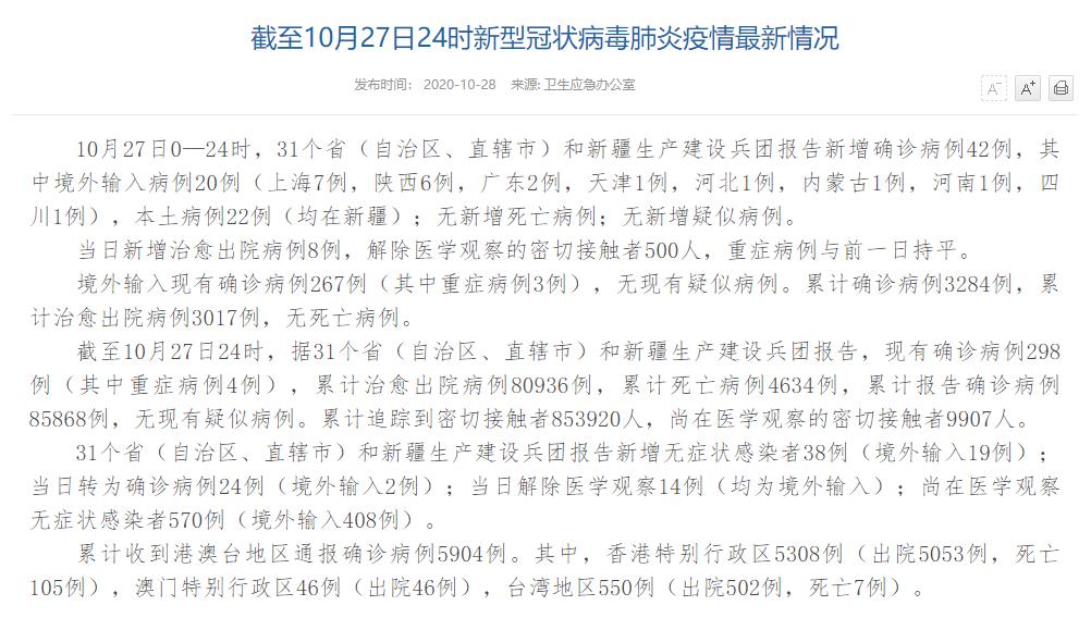 人民網(wǎng)北京10月28日電(董童)國(guó)家衛(wèi)生健康委于今日在官網(wǎng)發(fā)布的《截至10月27日24時(shí)新型冠狀病毒肺炎疫情最新情況》(以下簡(jiǎn)稱“情況”)提出,10月27日0—24時(shí),31個(gè)?。ㄗ灾螀^(qū)、直轄市)和新疆生產(chǎn)建設(shè)兵團(tuán)報(bào)告新增確診病例42例,其中境外輸入病例20例(上海7例,陜西6例,廣東2例,天津1例,河北1例,內(nèi)蒙古1例,河南1例,四川1例),本土病例22例(均在新疆);無(wú)新增死亡病例;無(wú)新增疑似病例。當(dāng)日新增治愈出院病例8例,解除醫(yī)學(xué)觀察的密切接觸者500人,重癥病例與前一日持平。